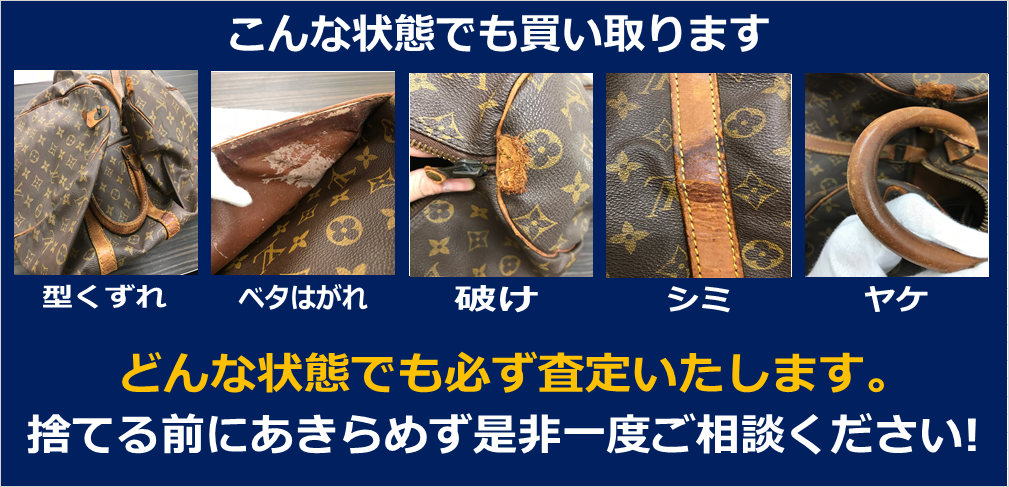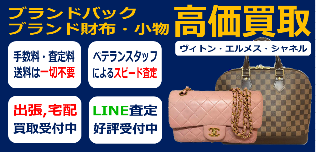 お使いにならなくなったブランドバック・小物を高価買取いたします。市場の取引価格に基づいて買取金額をご提示します。人気のラインはもちろん、シミ・スレ・しわなどがあっても買取いたします。他で買取されなかったものも買い取れる場合が多々あるのでぜひ一度ご相談ください。査定料などの手数料はいっさいかかりませんので、電話やラインなどでお気軽にお問い合わせください。