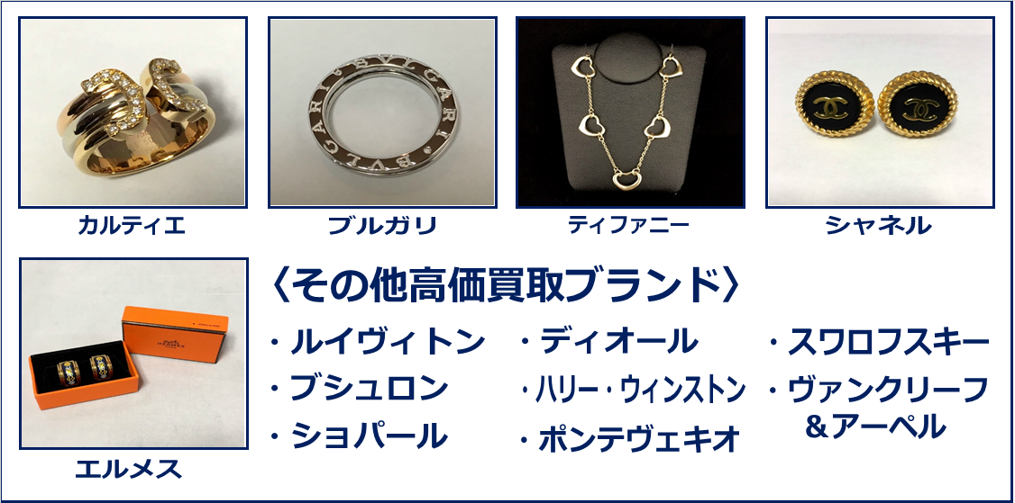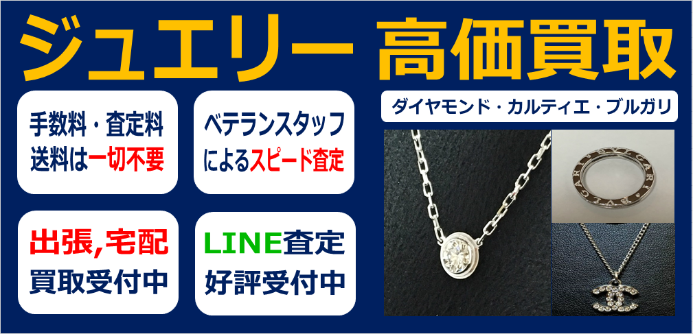 お使いにならなくなったブランドジュエリー・ダイヤモンドを高価買取いたします。市場の取引価格に基づいて正確に買取金額をご提示します。現行のモデルはもちろん、昔のモデルも買取します。使用キズ・へこみ・変形していても買い取ります。査定料などの手数料はいっさいかかりませんので、電話やラインなどでお気軽にお問い合わせください。